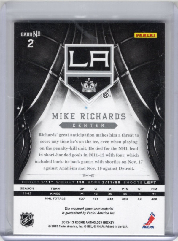 You are purchasing a 2013 2012-13 Panini Crown Royale Silhouette Mike Richards #2 Game-worn material. You will receive the exact item in the photographs. Thank you for looking.