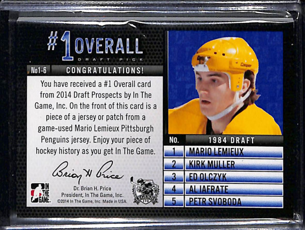 You are purchasing a 2014 In The Game Draft Prospects Mario Lemieux #NO1-6. You will receive the exact card in the photographs. Thank you for looking.