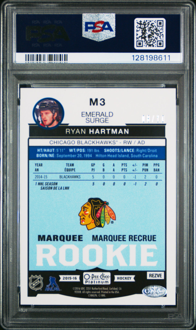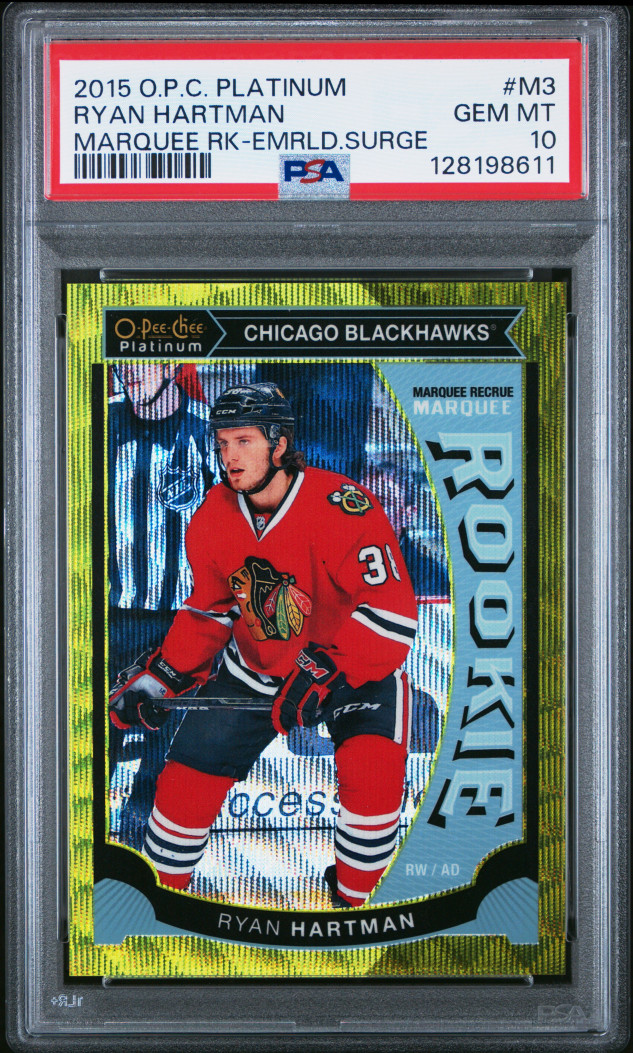 2015 O-Pee-Chee Platinum Marquee Rookies Ryan Hartman Marquee ROOKIE EMERALD SURGE /10 PSA GEM MINT 10 POP 1 HOLY GRAIL BLACKHAWKS HARTMAN ROOKIE