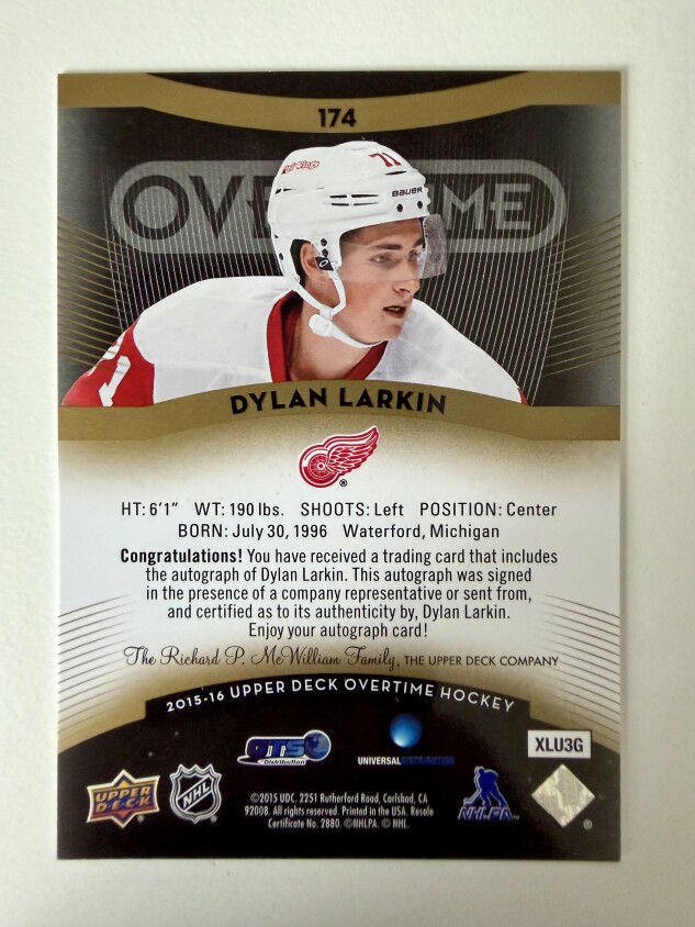 You are purchasing a 2015 Upper Deck Overtime Dylan Larkin Auto Rookie. You will receive the exact item in the photographs. Thank you for looking.