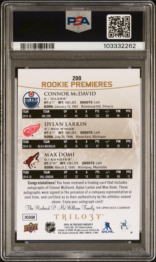 2015 Upper Deck Trilogy Connor McDavid Dylan Larkin Domi RC AUTO /25 PSA AUTH (PSA/DNA POPULATION 1 OF 1 - NONE GRADED HIGHER)
