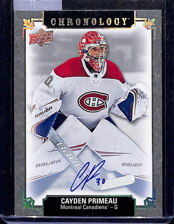 You are purchasing a 2019-20 Chronology Cayden Primeau #FH-MO-CP. You will receive the exact card in the photographs. Thank you for looking.
