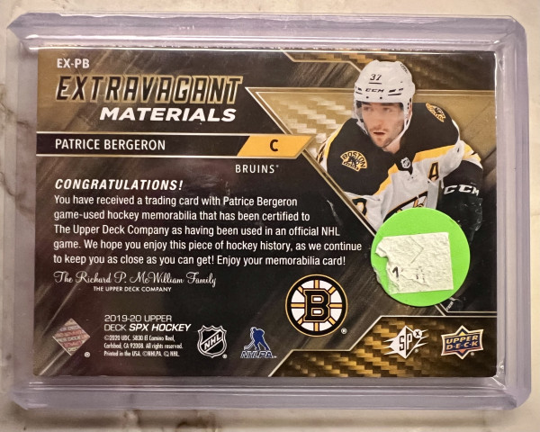 2019-20 SPx Patrice Bergeron Extravagant Materials Game Worn 15/15