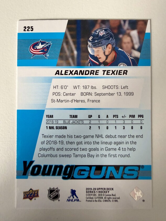 You are purchasing a 2019 Upper Deck Series 1 Young Guns Alexandre Texier Rookie. You will receive the exact item in the photographs. Thank you for looking.