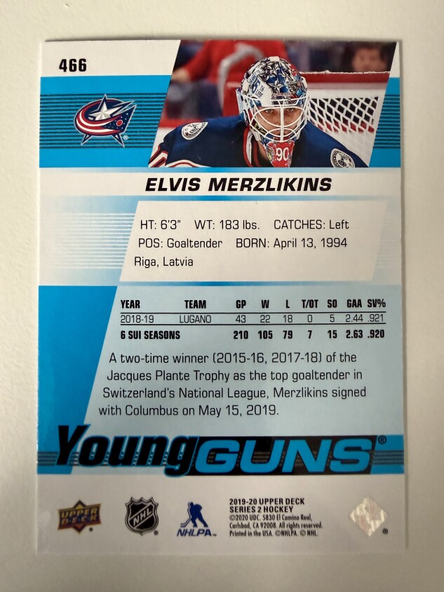 You are purchasing a 2019 Upper Deck Series 2 Young Guns Elvis Merzlikins Rookie. You will receive the exact item in the photographs. Thank you for looking.