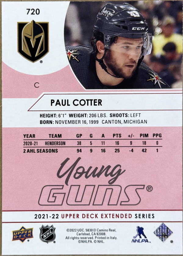 2021-22 Extended Series Paul Cotter Young Guns Exclusives /100