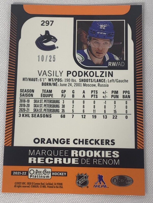 2021-22 OPC Platinum Vasily Podkolzin Orange Checkers /25 Marquee Rookie