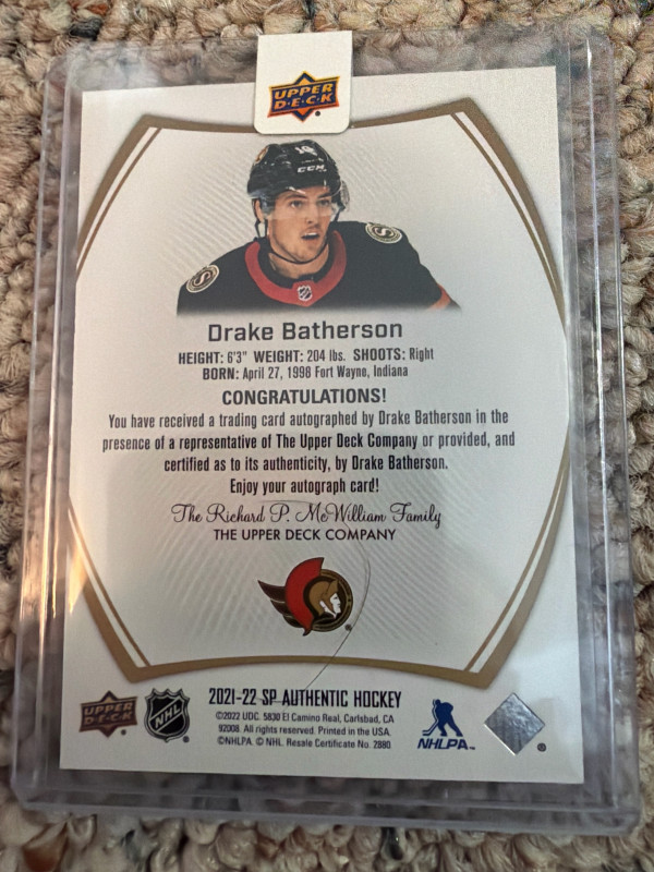 2021-22 SP Authentic Limited Drake Batherson Auto