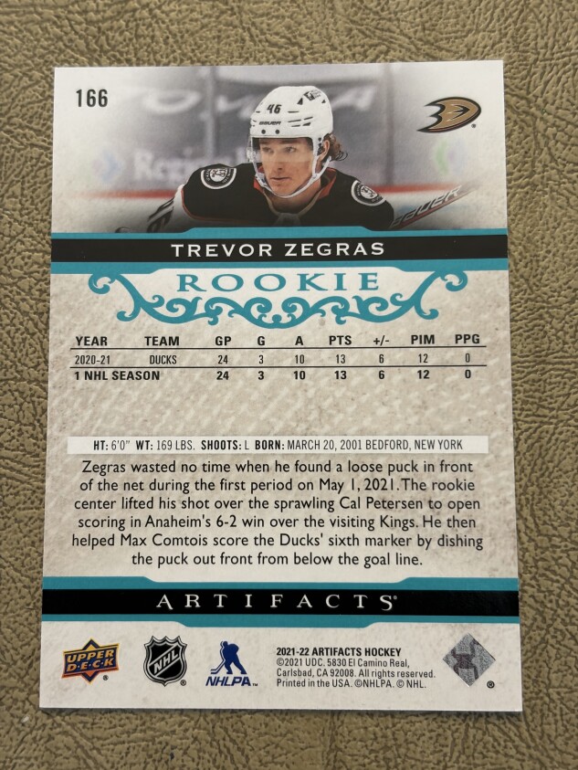 2021-22 Trevor Zegras Rookie Artifacts TEAL