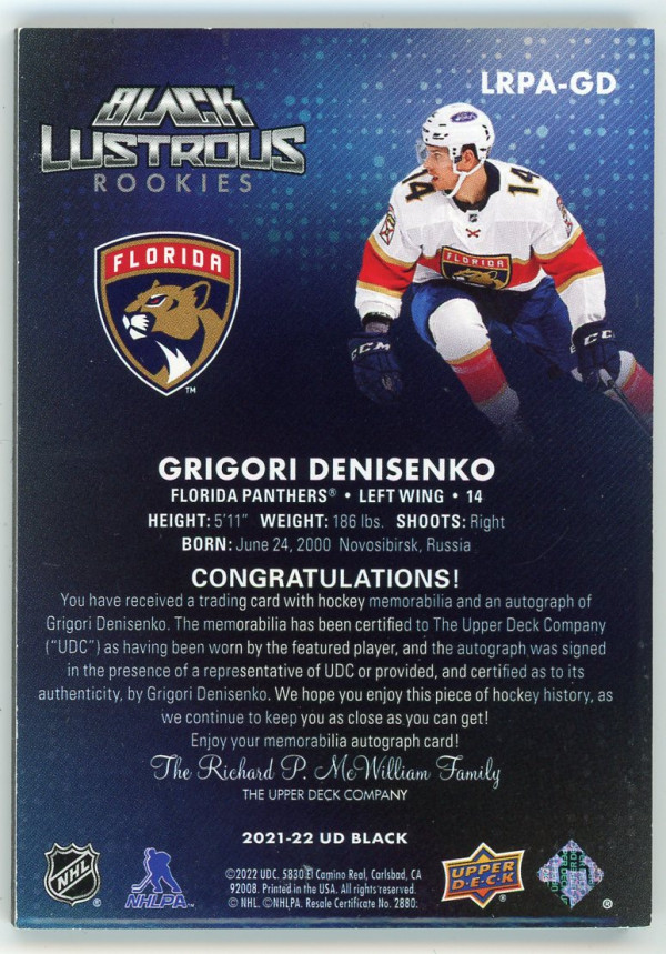 2021-22 UD Black Grigori Denisenko Lustrous Rookies Patch Autograph /125