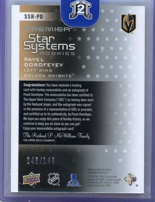 2021-22 UD Premier Pavel Dorofeyev Star Systems Rookie Patch Auto /149