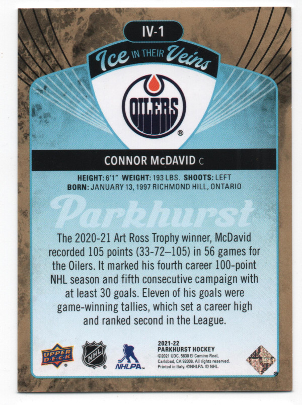 2021-22 Upper Deck Parkhurst Ice in Their Veins ePack Gold Parallel #IV-1 Connor McDavid