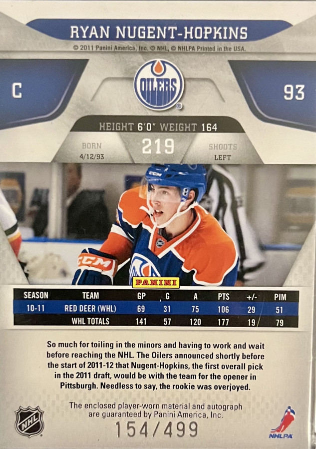 2022–23 Panini America NHL Certified Ryan Nugent-Hopkins Rookie Patch Autograph /499