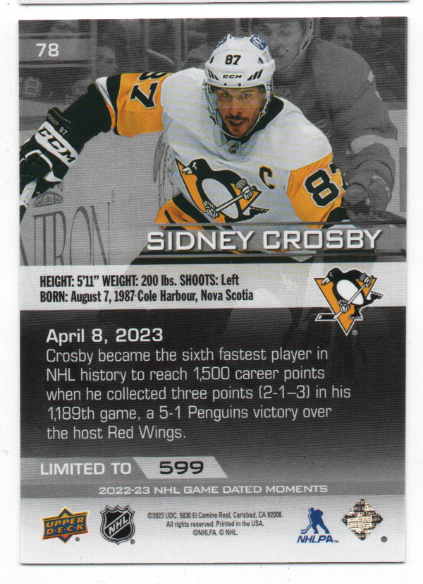 2022-23 Upper Deck Game Dated Moments #78 Sidney Crosby - April 8, 2023 /599