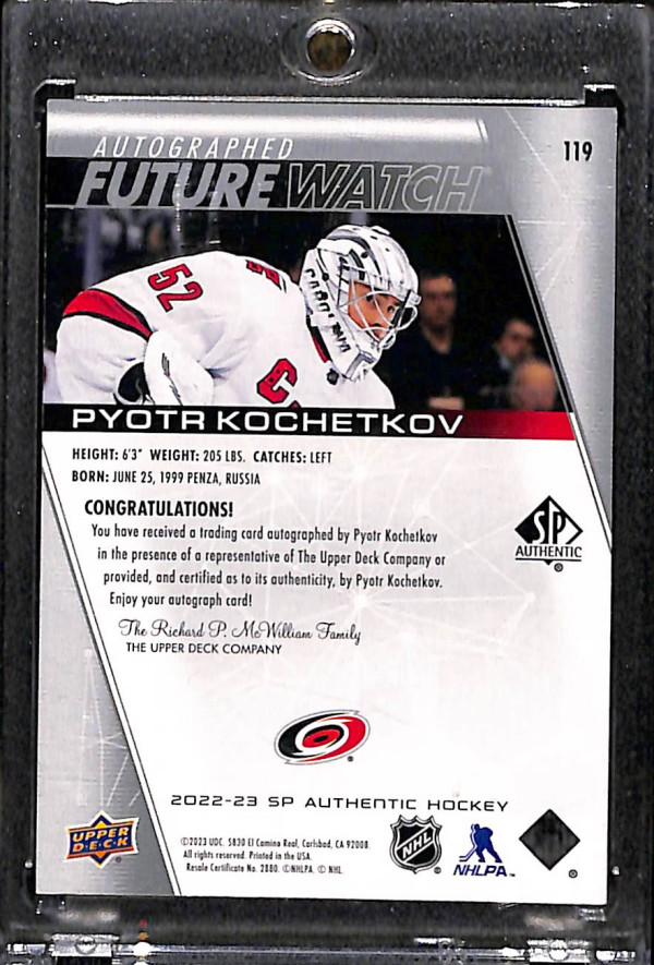 You are purchasing a 2022-23 Upper Deck SP Authentic Pyotr Kochetkov #119 415/999. You will receive the exact card in the photographs. Thank you for looking.