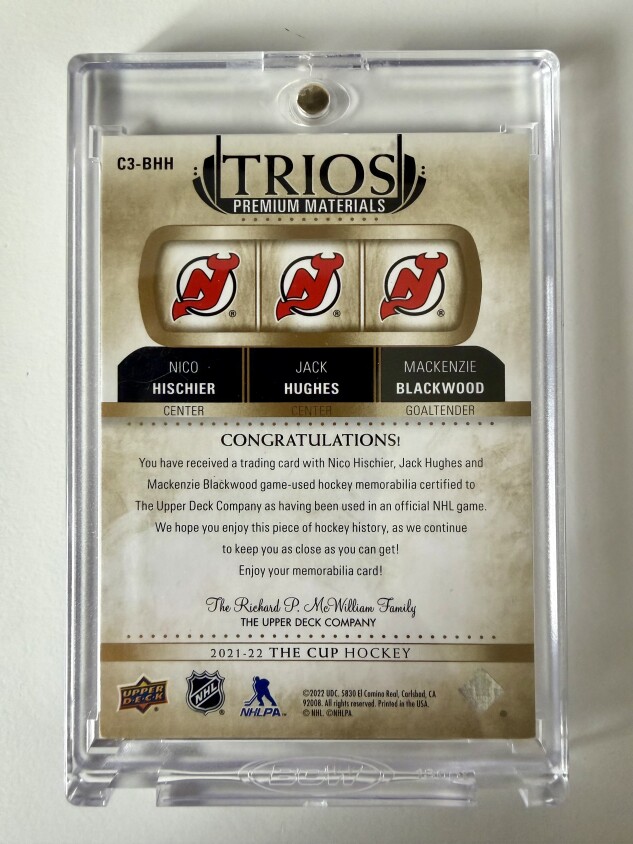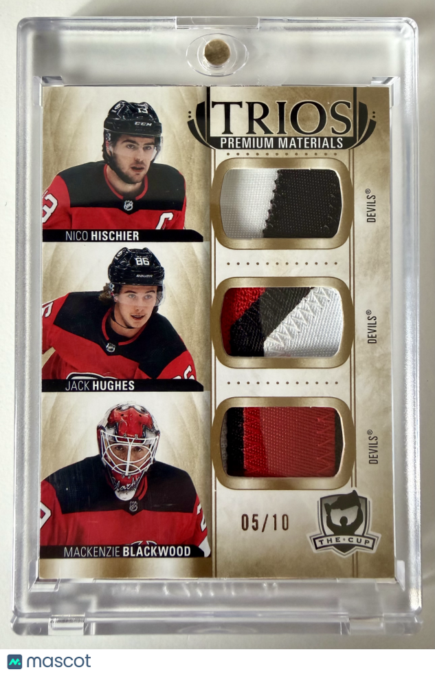 You are purchasing a 2022 Upper Deck The Cup Trios Premium Materials Mackenzie Blackwood Nico Hischier Jack Hughes 05/10 Patch. You will receive the exact item in the photographs. Thank you for looking.