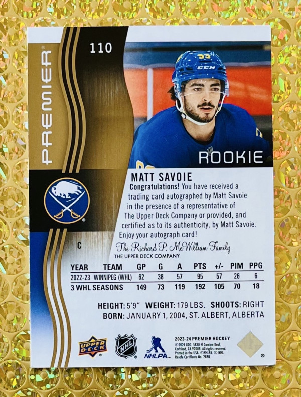 2023-24 UD Premier #110 Matt Savoie Auto RC Gold Parallel /35