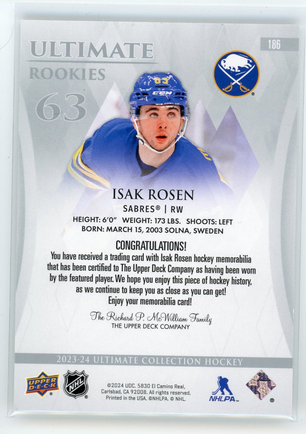 2023-24 Ultimate Collection Isak Rosen Rookie Jersey /599 #186