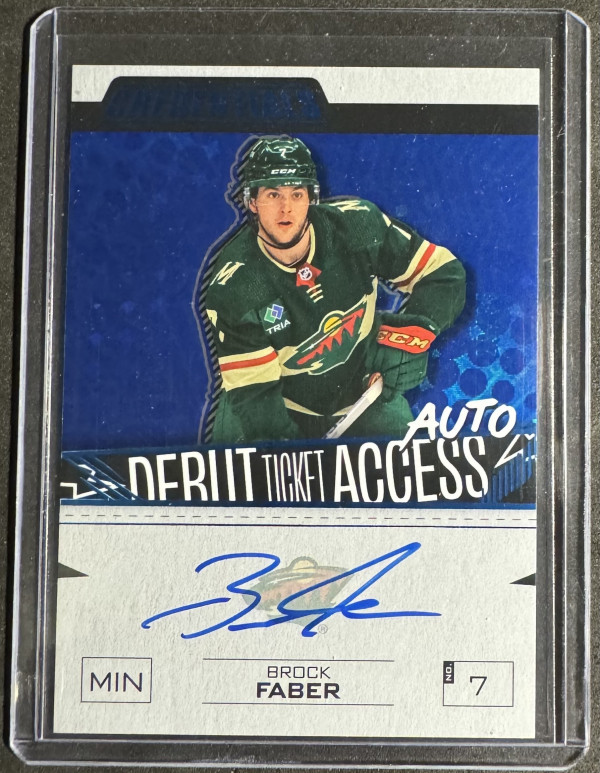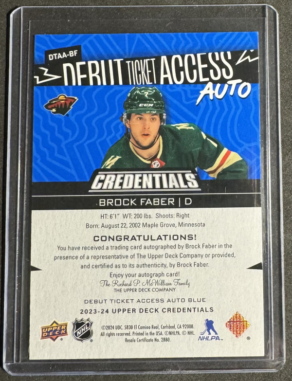 2023-24 Upper Deck Credentials DTAA-BF Brock Faber Debut Ticket Access Auto Blue /35