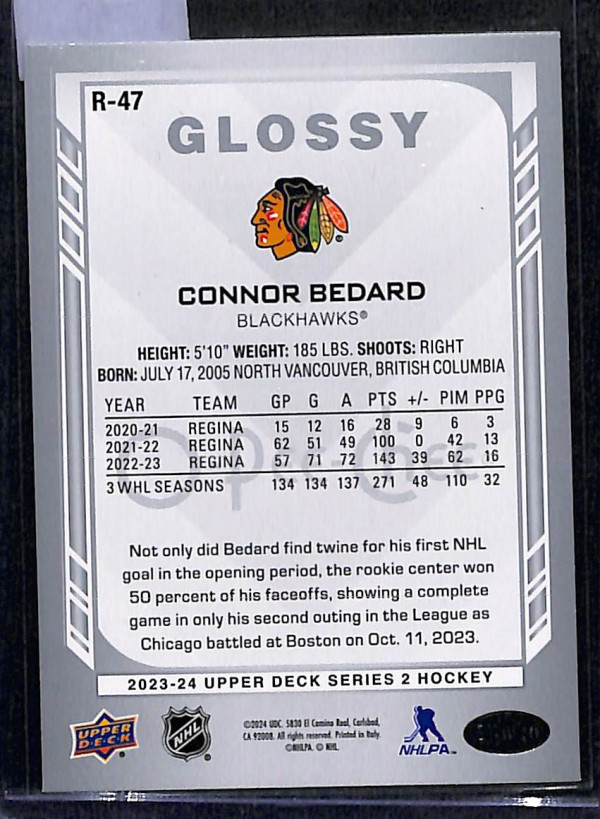 You are purchasing a 2023-24 Upper Deck Series 2 Connor Bedard #R-47. You will receive the exact card in the photographs. Thank you for looking.