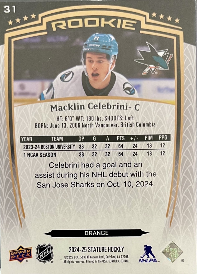 2023–24 Upper Deck Stature Macklin Celebrini Rookie /199