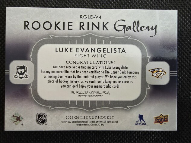 2023-24 Upper Deck The Cup Rookie Rink Gallery 09/35 Luke Evangelista Patch