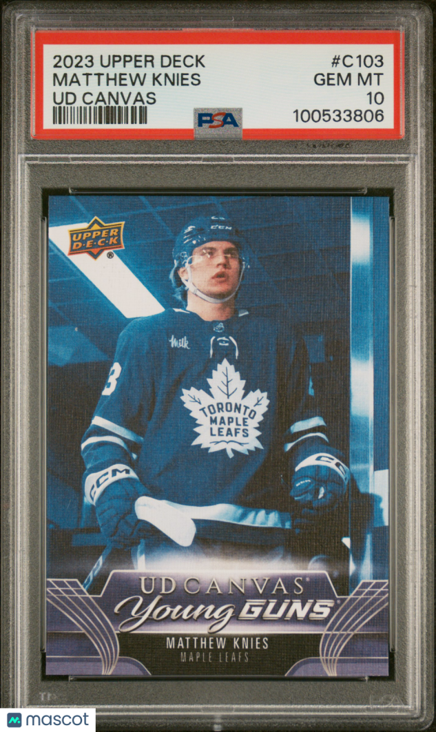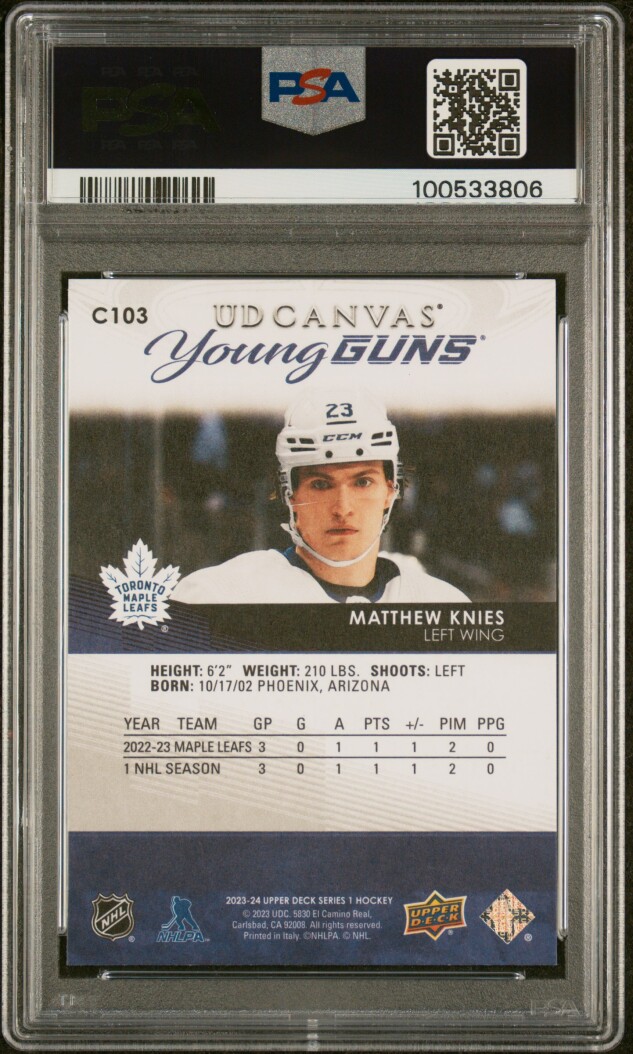 You are purchasing a 2023-24 Upper Deck UD Canvas Matthew Knies #C103 Young Guns Rookie PSA 10. You will receive the exact item in the photographs. Thank you for looking.