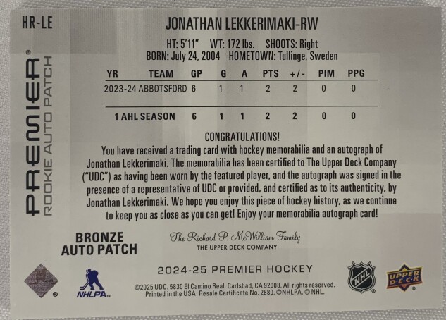 2024-25 Premier Hockey Jonathan Lekkerimaki Rookie Auto Patch Horizontal /99
