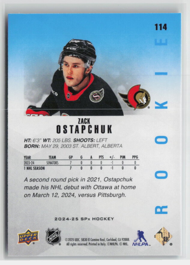 You are purchasing a 2024-25 SPx Hockey Zack Ostapchuk #114 Rookie. You will receive the exact item in the photographs. Thank you for looking.