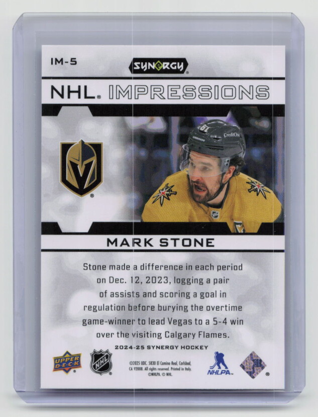 You are purchasing a 2024-25 Synergy Hockey Impressions Mark Stone #IM-5. You will receive the exact item in the photographs. Thank you for looking.
