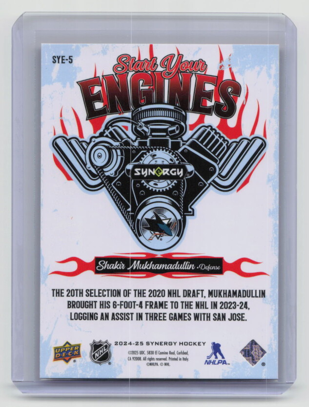 You are purchasing a 2024-25 Synergy Hockey Start Your Engines Shakir Mukhamadullin #SYE-5 Rookie. You will receive the exact item in the photographs. Thank you for looking.