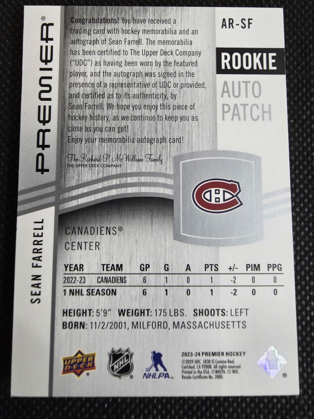 2024-25 UD Premier SEAN FARRELL Patch AUTO RC 166/249 *RPA