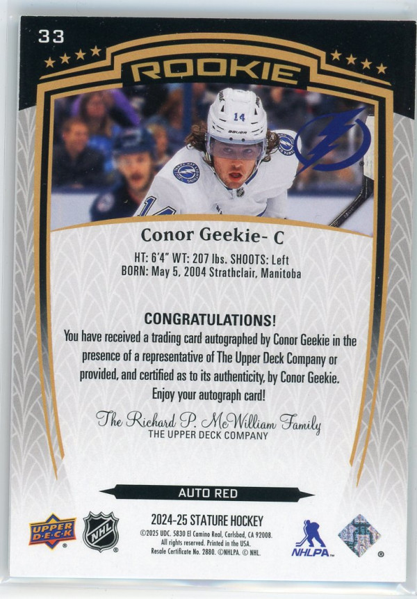 2024-25 UD Stature Conor Geekie Rookie Autograph Red 73/99 #33