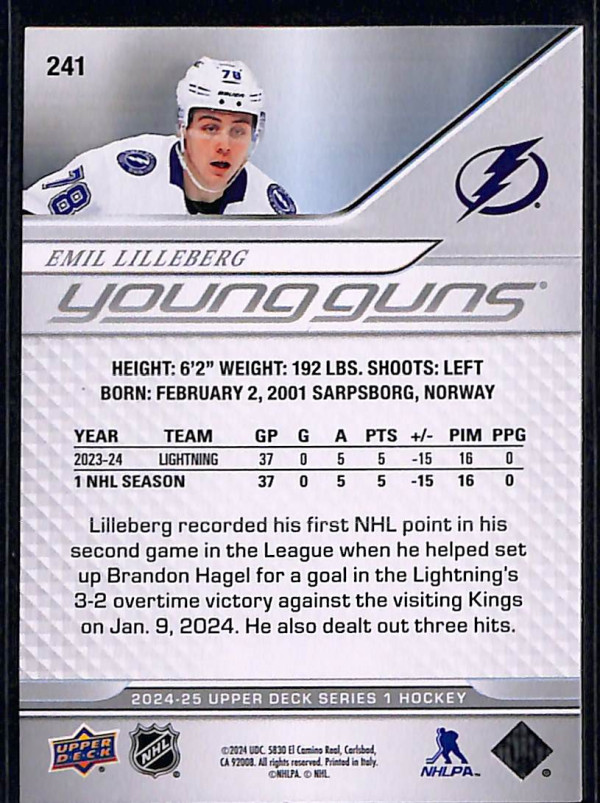 You are purchasing a 2024-25 Upper Deck Series 1 Emil Lilleberg #241. You will receive the exact card in the photographs. Thank you for looking.