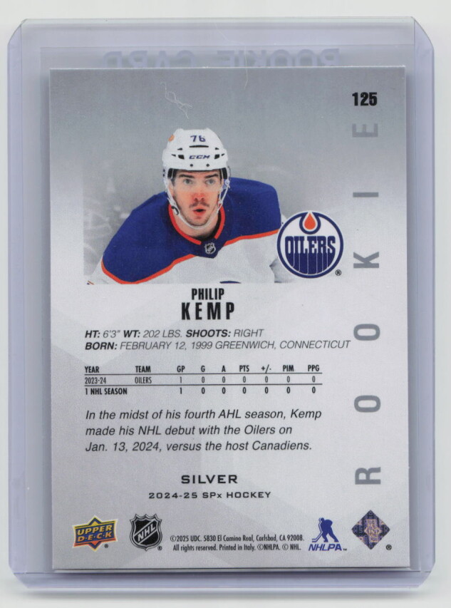 You are purchasing a 2024-25 Upper Deck SPx Hockey Philip Kemp #125 Silver Rookie. You will receive the exact item in the photographs. Thank you for looking.
