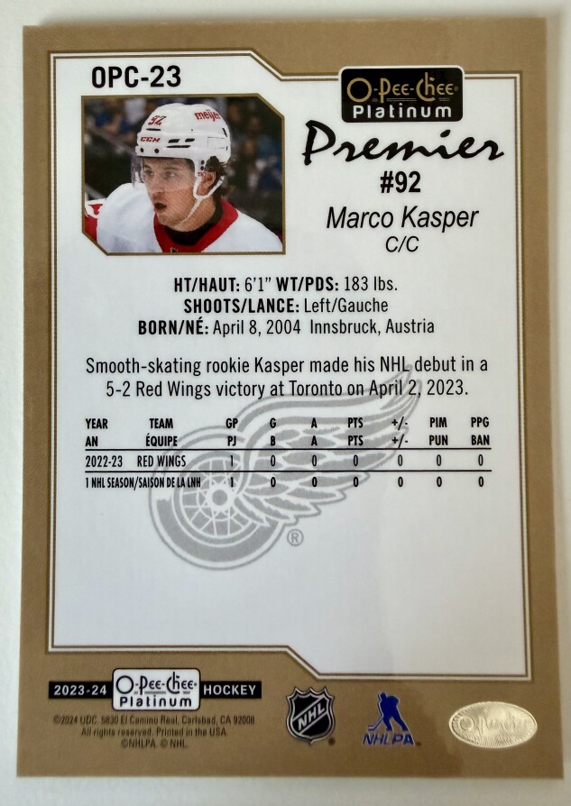 You are purchasing a 2024 O-Pee-Chee Platinum Premier Marco Kasper Red Rookie. You will receive the exact item in the photographs. Thank you for looking.