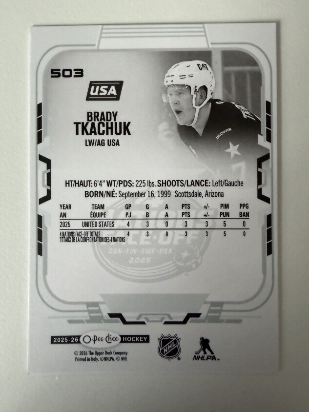 You are purchasing a 2025 O-Pee-Chee Hockey Brady Tkachuk #503 4 Nations Face-Off. You will receive the exact item in the photographs. Thank you for looking.
