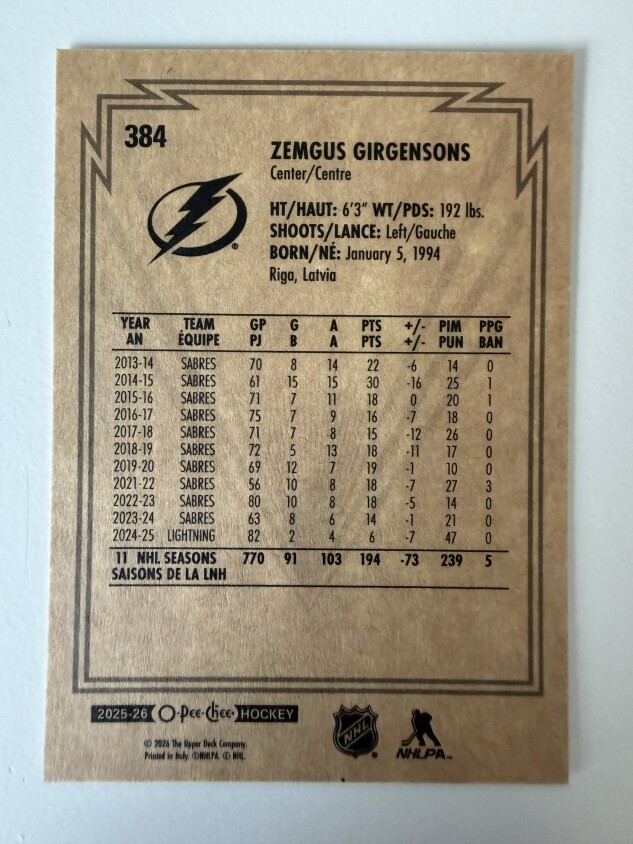 You are purchasing a 2026 O-Pee-Chee Zemgus Girgensons #384. You will receive the exact item in the photographs. Thank you for looking.