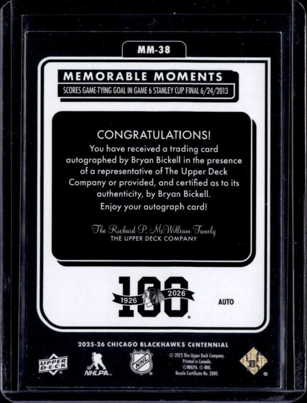 25/26 UD CHICAGO BLACKHAWKS CENTENNIAL MEMORABLE MOMENTS AUTOGRAPH #MM-38 BRYAN BICKELL SP