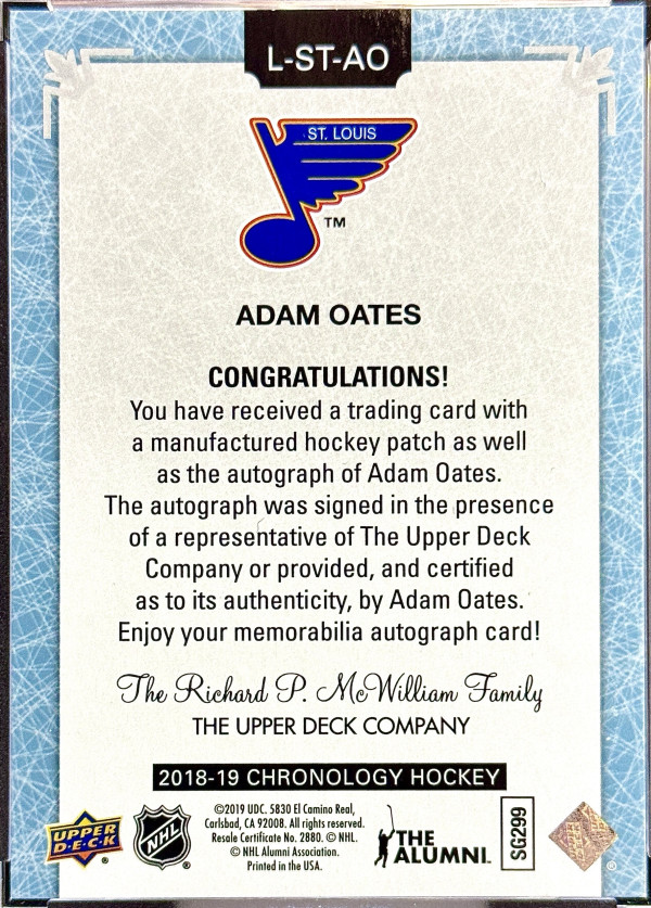 Adam Oates 2019-20 Chronology Letterman Auto “A” 19/20