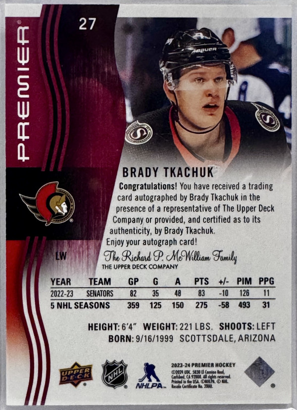 Brady Tkachuk Red SP Auto -- 2023-24 Premier Hockey