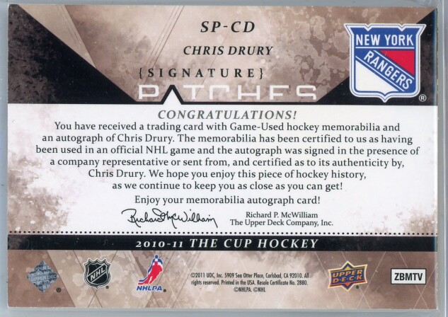 Chris Drury 2010-11 The Cup Signature Patches 67/75 #SP-CD