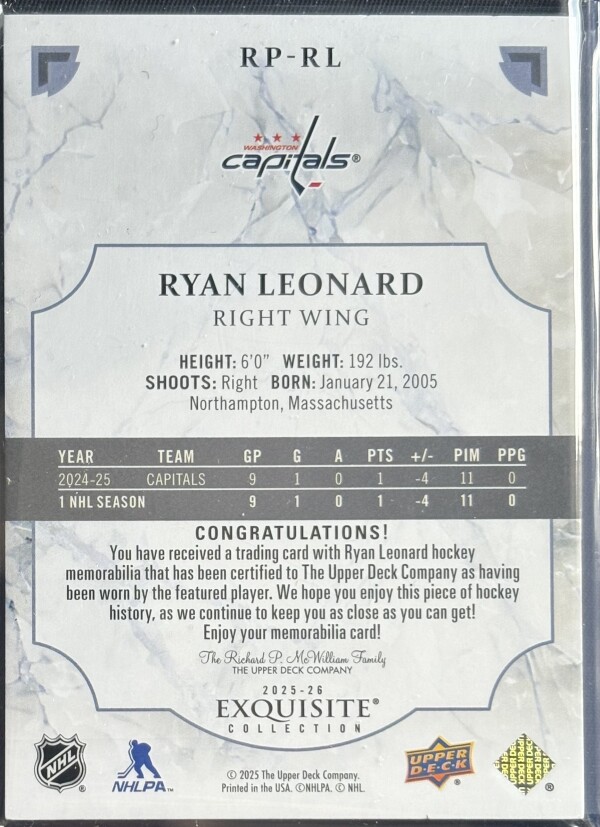 2025-26 Black Diamond Exquisite Collection Ryan Leonard Rookie (2 Color) Patch 88/99