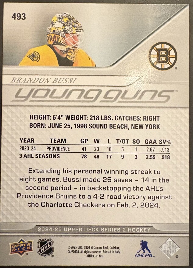 BRANDON BUSSI YOUNG GUNS #493 - 2024-25 UPPER DECK SERIES 2