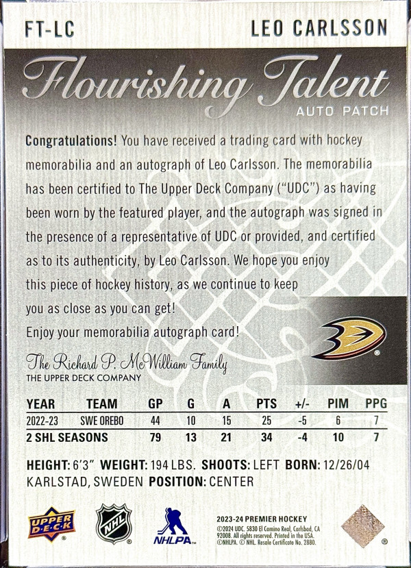 Leo Carlsson 2023-24 Premier Flourishing Talent Rookie Patch Auto 42/50