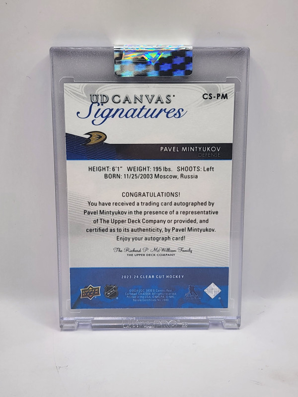 Thanks for your looking at my listing Pavel Mintyukov 2023-24 Upper Deck Clear Cut Canvas Signatures Autograph Red /34. Let me know if you have any questions!