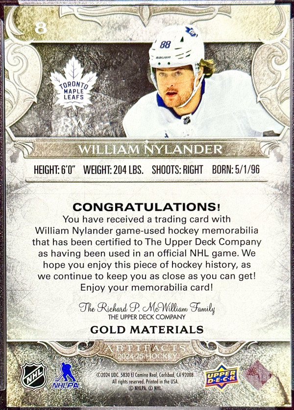 William Nylander 2024-25 Artifacts Gold Materials Dual Jersey 010/299