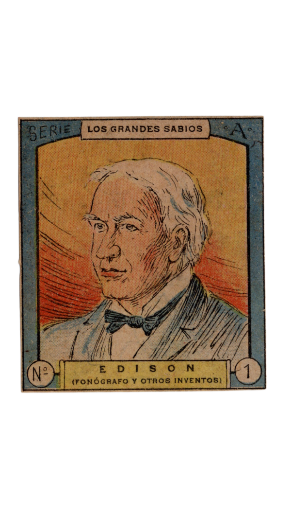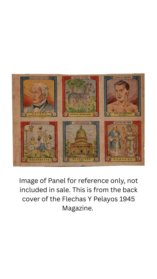 Flechas y Pelayos “Arrows and Pelayos” was a Spanish magazine of the Frente de Juventudes, a national delegation of the youth front under the dictatorship of General Franco. It began publication in 1937 to indoctrinate youth organizations of the Flange (fascista), known as Flechas (arrows), of the Carlista party, known as Pelayos (to honor Don Pelayo). In late 1945 and early 1946, the magazine printed panels of 6 cards of various themes and series to be hand-cut and collected. There were 6 series (A thru F) that had 24 cards in each. The Thomas Edison card measures 2.25" x 2.5"