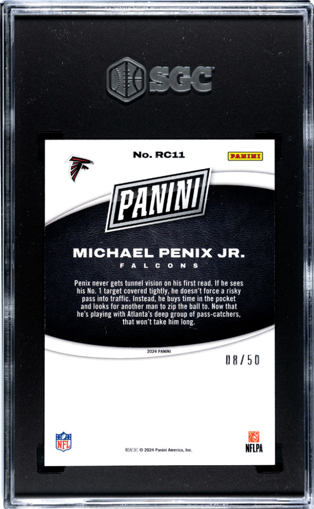 You are purchasing a 2024 Panini Black Friday Michael Penix JR #RC11 Blue Rookie /50 Atlanta Falcons SGC 10. You will receive the exact item in the photographs. Thank you for looking.