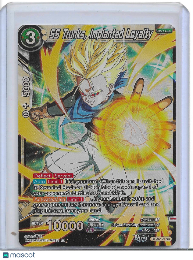 The SS Trunks, Implanted Loyalty BT29-121 card from Dragon Ball Super Fearsome Rivals is a rare collectible card game item manufactured by Bandai in 2026. This standard-sized card features the character Trunks with 5000 HP and an attack power of 10000. Illustrated by Hitoshi Ariga, the card is printed on card stock material with a foil finish, making it a valuable addition to any Dragon Ball Super card collection. With its alternative art design and unique features, this super rare card is sure to appeal to fans of the franchise.